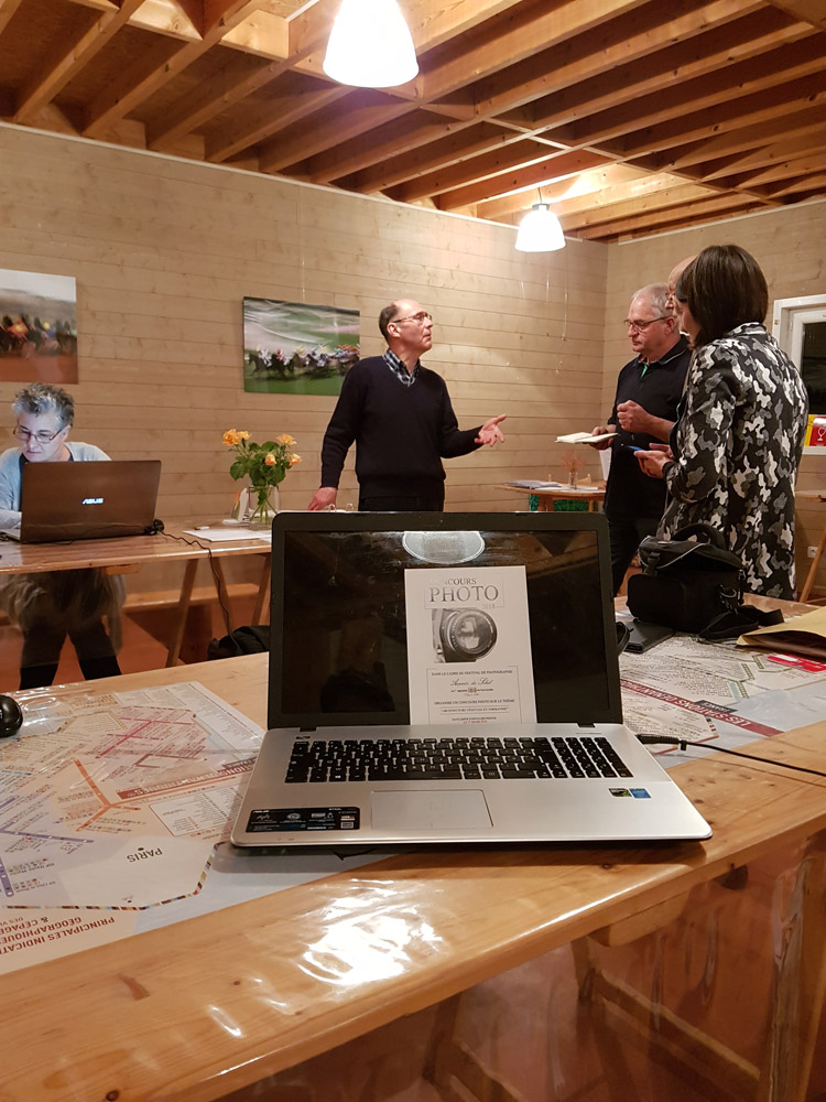 Présentation des photographes, recrutés par Philippe Dorléans, lui-même photographe membre du jury, et de Gérard Samson, le vigneron créateur des Arpents du Soleil et de ce festival. Au total donc, 5 personnes: un nombre impair, ce qui sera bien pratique pour voter quand on ne sera pas d’accord…